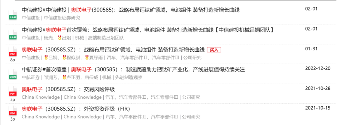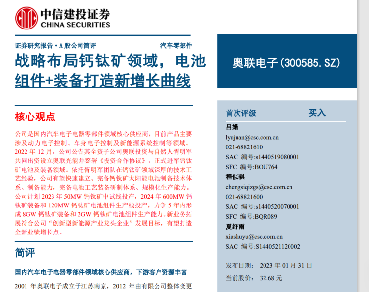1月31日晚间,中信建投吕娟团队还发布首次覆盖报告《战略布局钙钛矿领域,电池组件+装备打造新增长曲线》,在研报发布时奥联电子股价为32.68元。