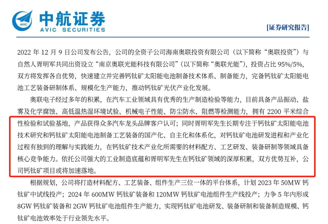 2022年12月中旬,中航证券率先发布首次覆盖报告《制造底蕴助力钙钛矿产业化,产线进展值得持续关注》,点出“钙钛矿”概念,并给予“买入”评级,该研报显示彼时奥联电子的股价仅19.17元。不过,纵观该研报,主要从公司角度对公司竞争力进行梳理,泛泛提及“胥明军先生长期专注于钙钛矿太阳能电池技术研究”等信息,并未提及广受争议的“华能清能院”项目。