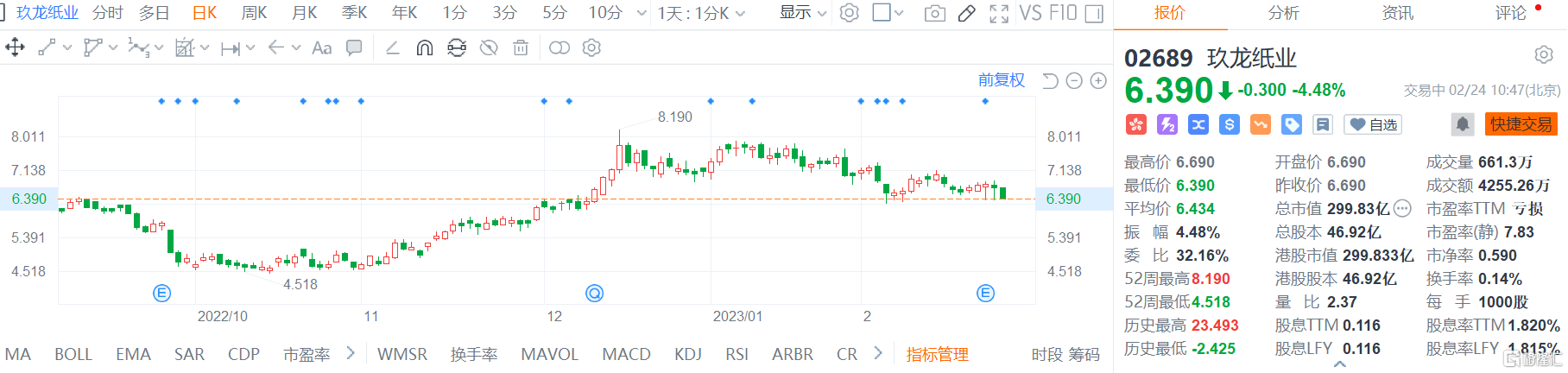 格隆汇2月24日丨玖龙纸业(2689.HK)股价续跌4.5%,报6.39港元,总市值299.8亿港元。公司截至2022年12月31日止六个月收入减少9.5%至约人民币311.98亿元,权益持有人应占亏损约为人民币13.89亿元,去年同期应占盈利27.75亿元。高盛指,业绩略逊该行预期,但符合此前公布的盈警。公司未公布中期股息,而去年同期派息率为14%。将公司23-25年盈利预测上调0-1%,维持目标价4.5港元及“沽售”评级。